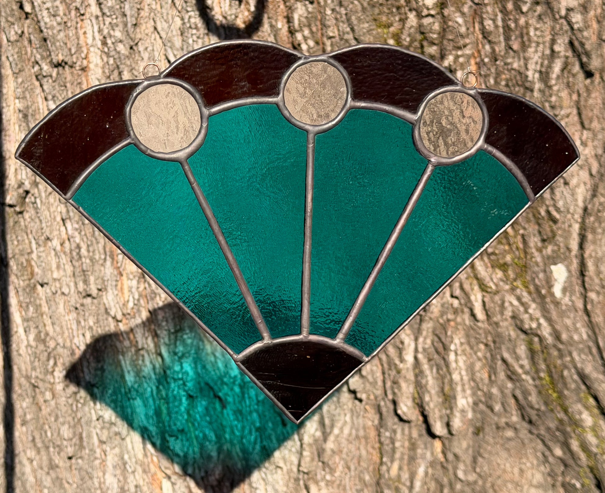 This handcrafted stained glass panel features a bold fan-shaped design with rich teal and deep amber tones that catch the light beautifully. Accented with textured circular details, it adds a touch of vintage charm and elegance to any space. Perfect for hanging in a window, it transforms sunlight into a warm, colorful display throughout the day. A unique decorative piece, it brings both artistry and character to your home décor.